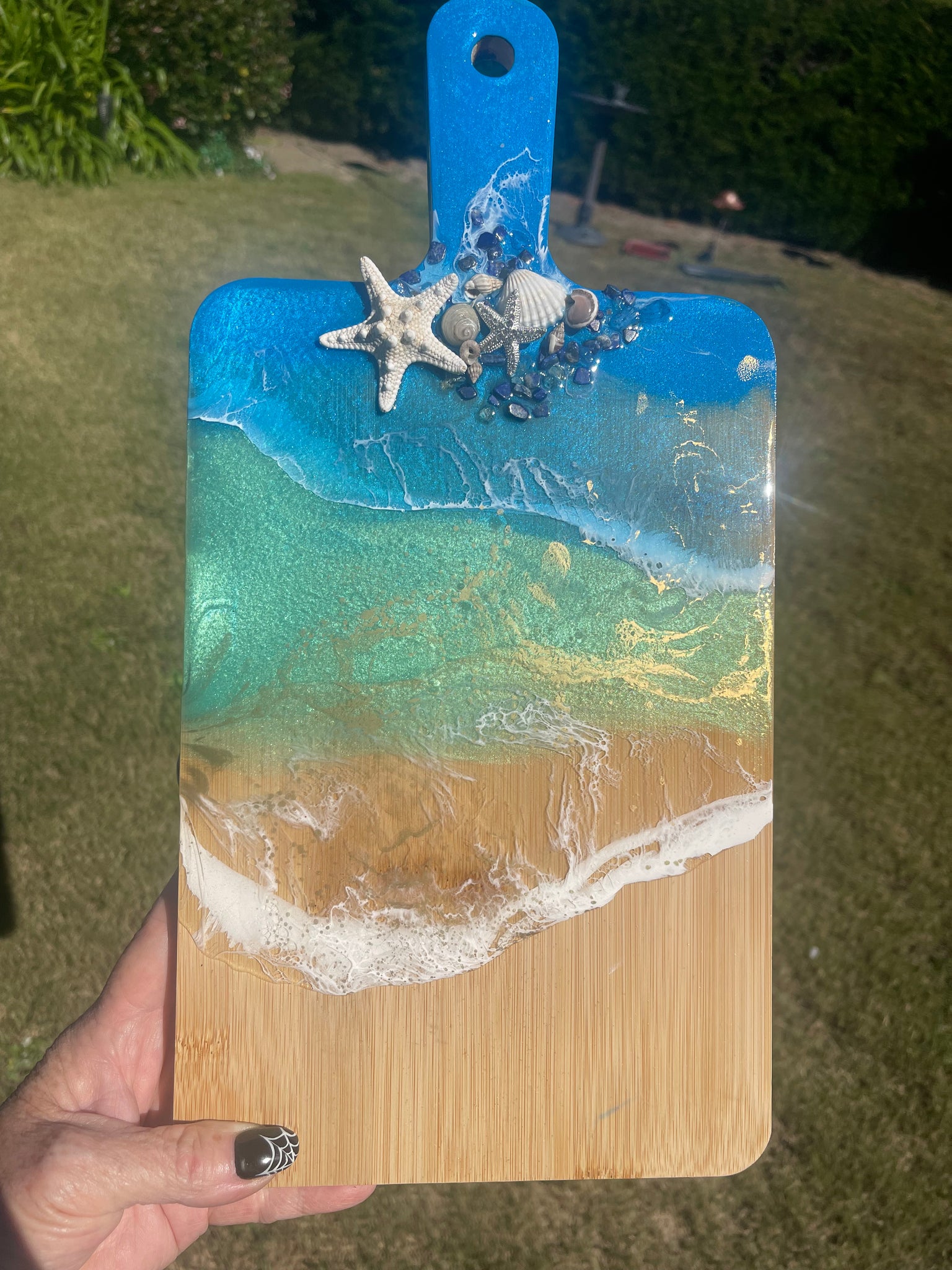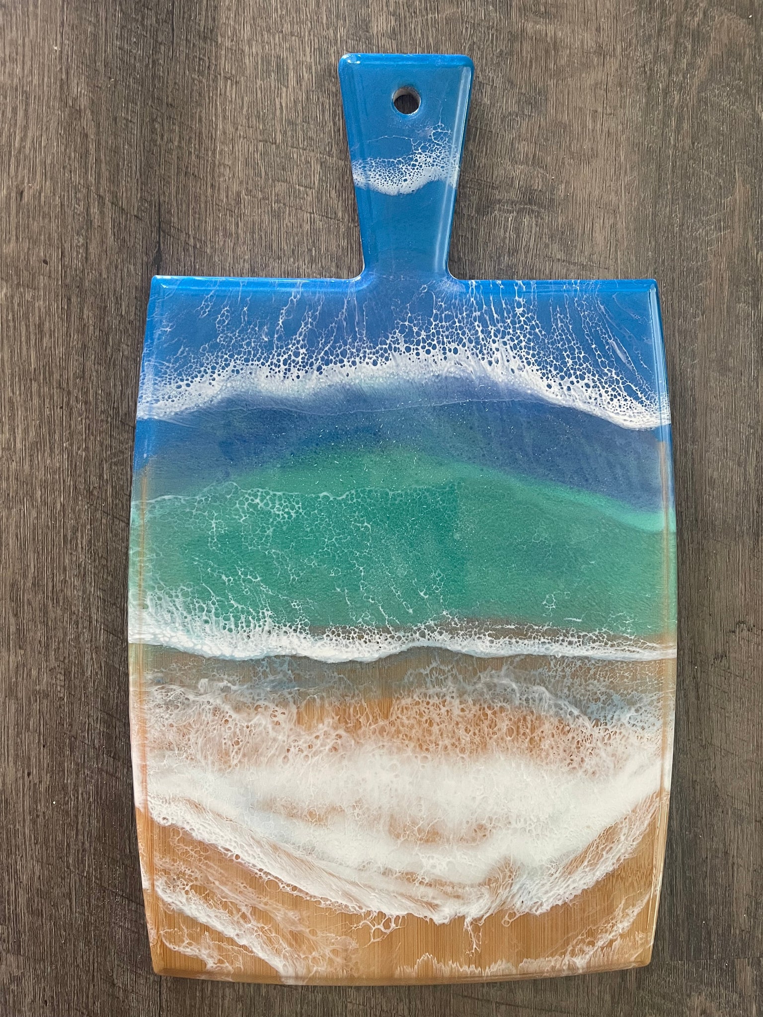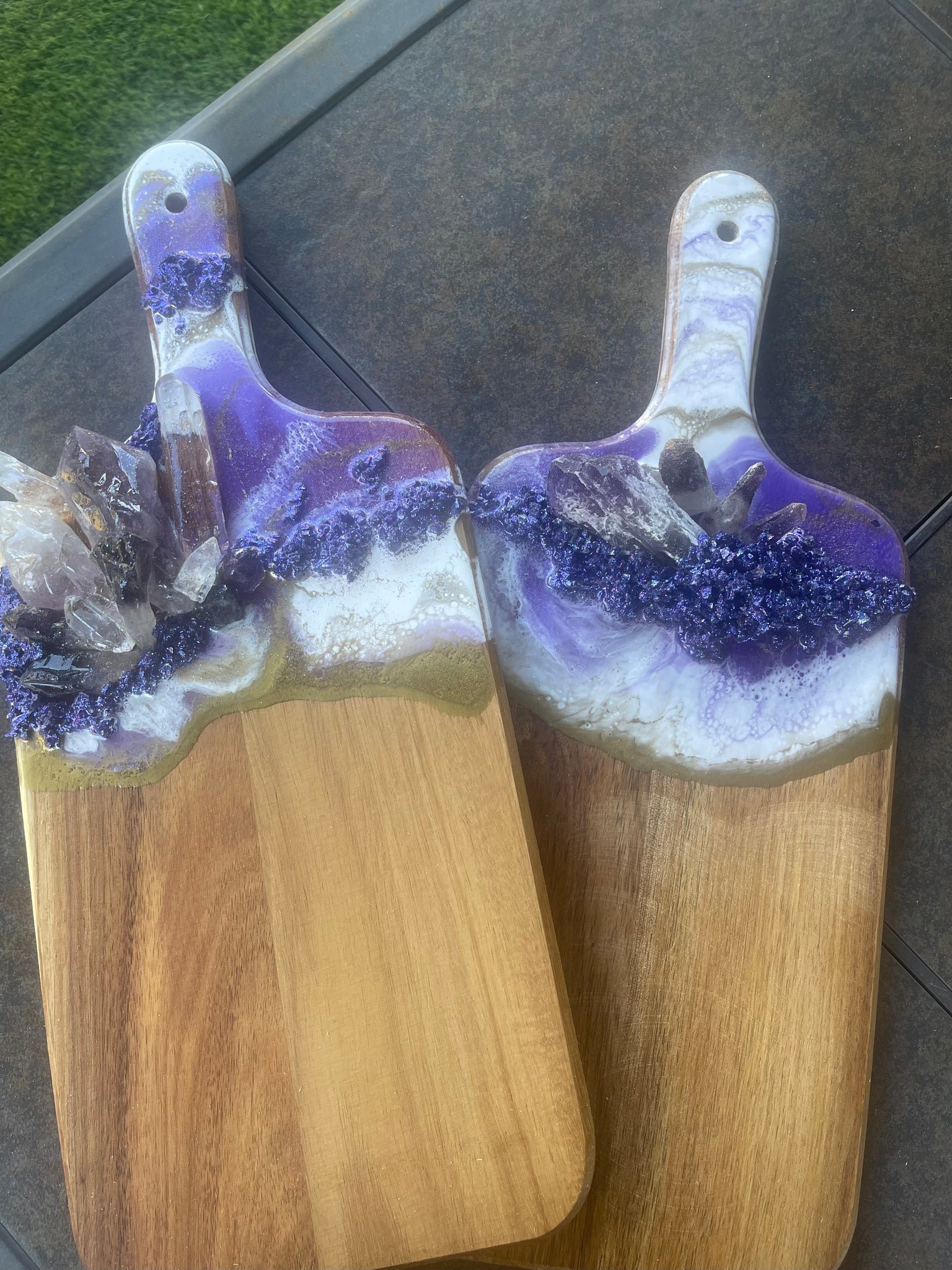 your choice of Ocean pour cheeseboard, Crystal cheeseboard, or Crystal resin painting size 8”x8”.